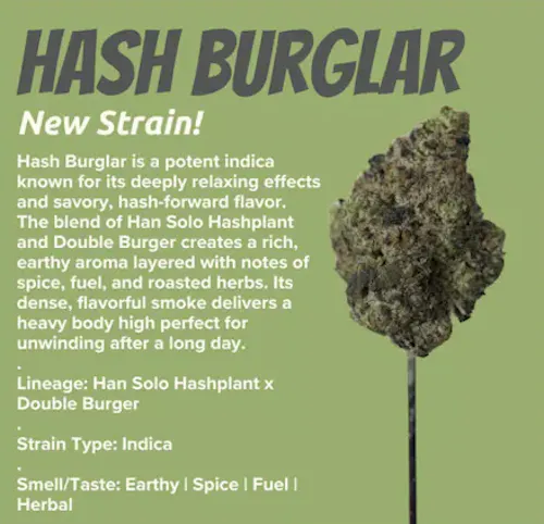 Hash Burglar is a potent indica known for its deeply relaxing effects and savory, hash-forward flavor. The blend of Han Solo Hashplant and Double Burger creates a rich, earthy aroma layered with notes of spice, fuel, and roasted herbs. Its dense, flavorful smoke delivers a heavy body high perfect for unwinding after a long day.